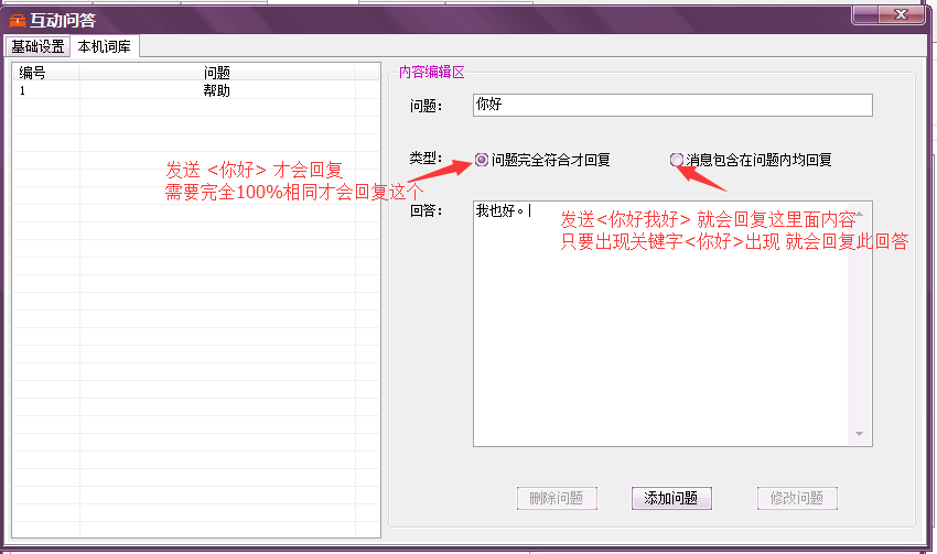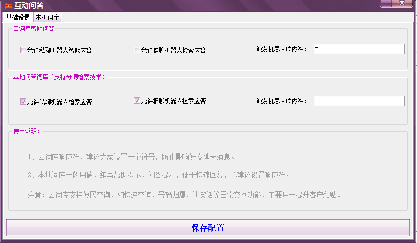 互动问答插件 基础设置 主要用于自定义指令,云词库功能有 快递查询,号码归属这样的。但是不建议在返利群里开启,以免影响到其他正常的用户。 本机词库 本机词库功能就是给机器人设置指定回复的 比如 帮助 这样的提示语