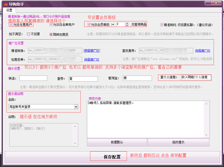 精准转换:为用户直接发送淘口令或者商品连接,然后机器人返回的信息就使用此推广位的pid (阿里妈妈不允许精准查询商品,所以使用此功能造成的后果,你应知晓! 基本上扣分都是被同行举报)
