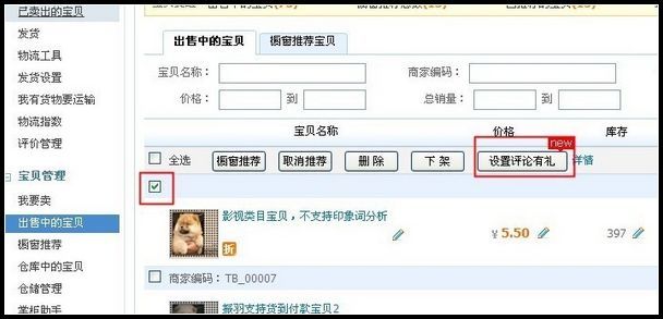 1、进入【淘宝卖家中心】-【出售中宝贝】页面,“勾选”需要参加评论有礼活动的商品,然后点击“设置评论有礼”,如下图: