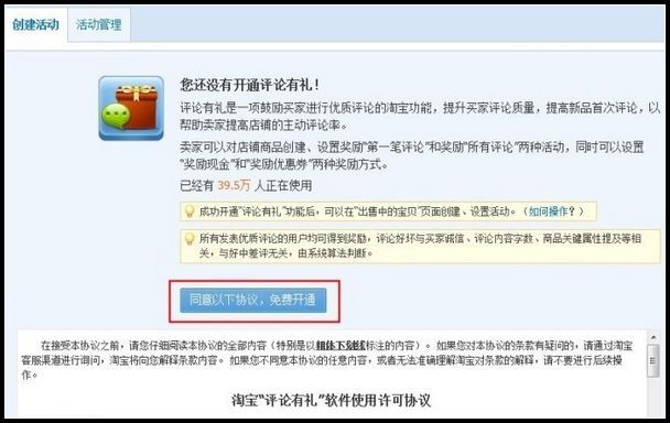 2、进入活动创建页面后,免费开通评论有礼功能:认真阅读功能协议,点击“同意以下协议,免费开通”: