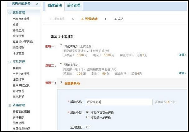 6、查看已创建设置成功的评论有礼活动的路径:我是卖家》评价管理》活动管理