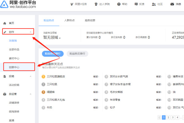 登录创作平台(we.taobao.com),在左边的菜单栏中打开【创作】,就可以找到创意中心了,如下图所示: