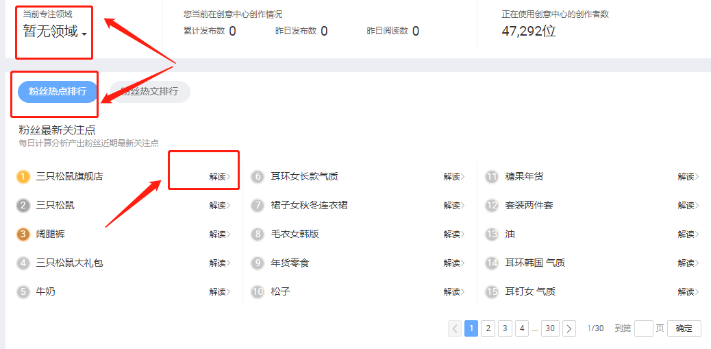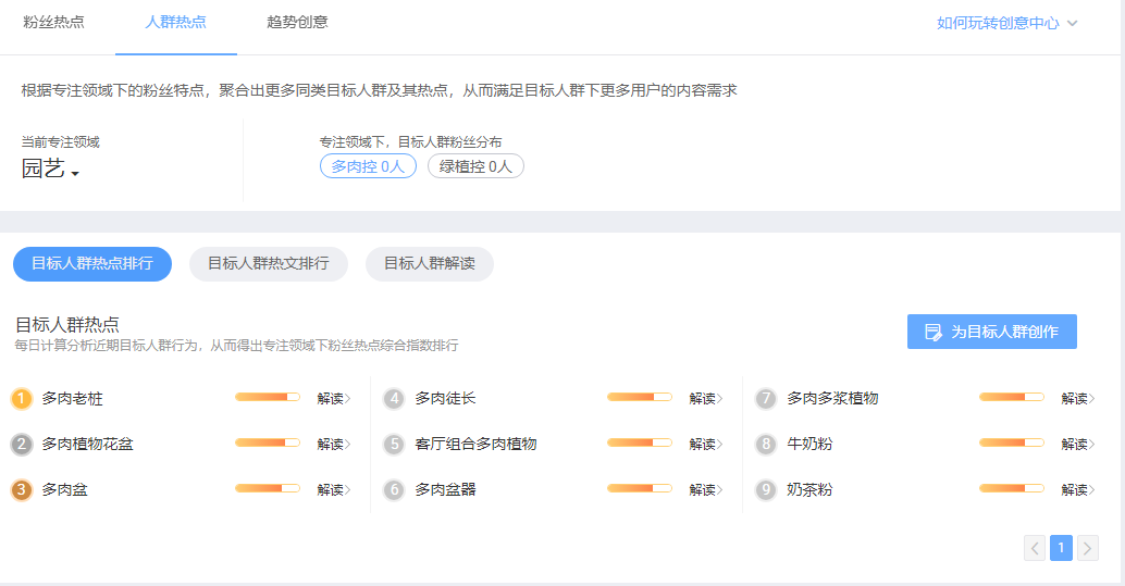 第二个人群板块,也可以选择领域,查看目标人群的热点排行、热文排行并对目标人群进行解读。在这里既可以分析目标人群,也可增加潜在的粉丝哦。
