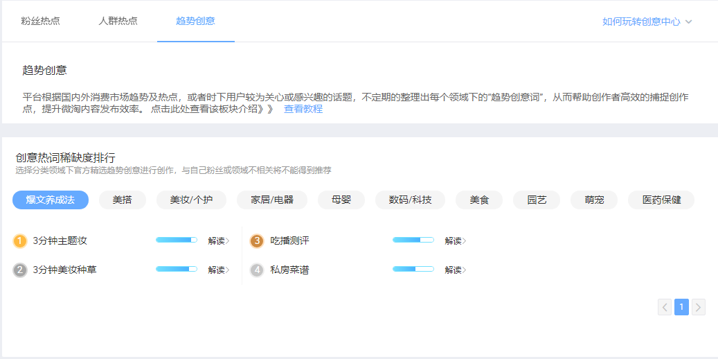 进入到创意中心,我们可以看到顶端有粉丝热点、人群热点和趋势创意三个栏目。趋势创意是最新上新的一个栏目。