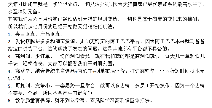 其二天猫是不能一刀切的,这毕竟不是小数目,马上双十一来临,阿里也是要数据的,但不得不讲的是,每次规则更新,都会有一批玩家被淘汰,同时也意味着,店群技术会再上一层楼。