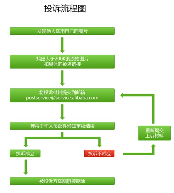 投诉盗图的邮箱:postservice@service.alibaba.com盗图的处理结果:投诉方投诉不成立,会邮件通知投诉方要求提供相关证据。