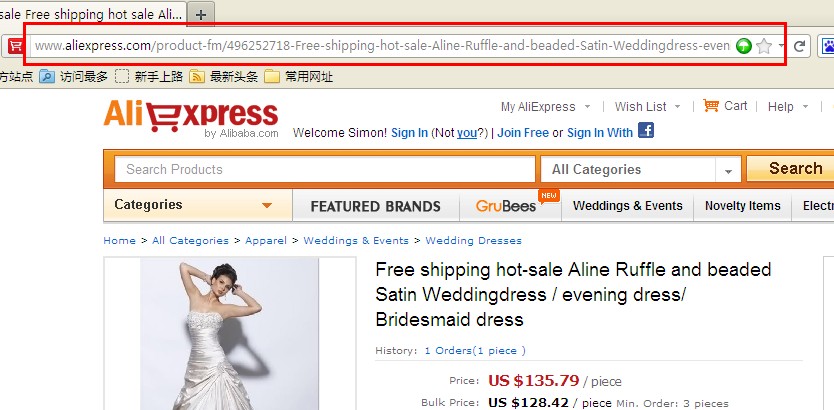 步骤二: 进入商品detail页面以后,请您查看该商品detail页面的网址链接,如下图所示: