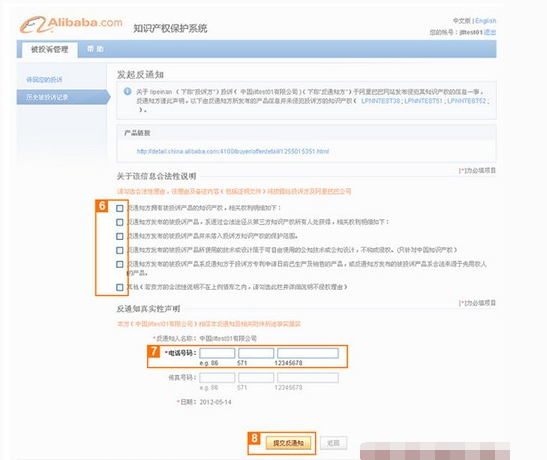 (3)在“发起反通知”页面填写反通知表单。如下图: