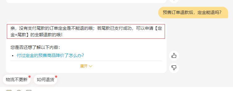 若是卖家责任(如卖家旺旺表示缺货),导致无法完成尾款支付,您可旺旺联系卖家,协商具体退定金方案。