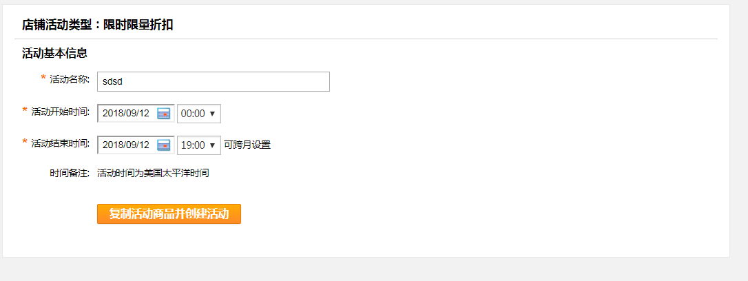Step2:点击“复制”后,进入设置页面,检查活动名称、活动开始时间、活动结束,如需修改请重新输入,再点击“复制活动商品并创建活动”: