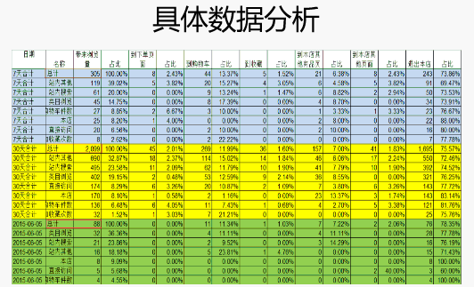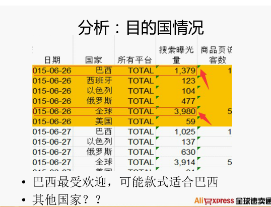 通过具体速卖通数据分析,对比速卖通店铺流量的各渠道比例;同时对比分析速卖通平台的搜索关键词;还有每周数据和每月数据的对比,看上升还是下降,分析产品的“健康状况”;最后还要分析速卖通产品的引流情况。