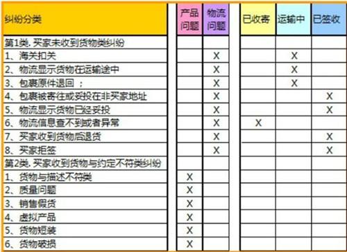 速卖通平台对纠纷有详细的分类,共两类十四项。一方面,速卖通上的纠纷可以分为有关物流问题的纠纷或者是有关产品问题的纠纷;另一个维度,可以看成处于不同物流状况下的纠纷,可以标记为已收寄的纠纷、运输过程的纠纷、已签收的纠纷。只有对问题正确的分类,才能对症下药,对纠纷也是如此。