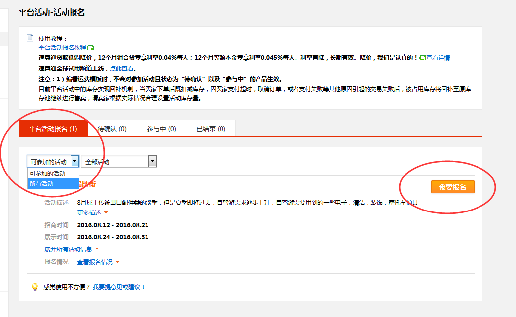 首先在后台营销活动点击速卖通平台活动,选择“可参加的活动”,点击“我要报名”: