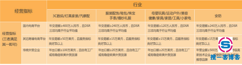 不同的行业在不同的电商平台的经营指标不同,行业分为四大类,分别是3C数码/灯具家装/汽摩配,服装配饰/鞋包/珠宝/手表/婚纱礼服,母婴玩具/运动户外/美容健康/家具/小家电,安防,从国内电商平台、其他跨境电商平台、传统外贸企业的年交易额,和服务指标有不同的要求,详情见下表: