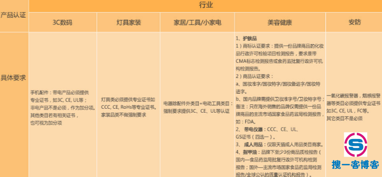 产品认证的行业是分为3C数码,灯具家装,家居/工具/小家电,美容健康,安防五类,对这无泪的产品有一些要求,不同的行业,要求不同,具体要求见下图: