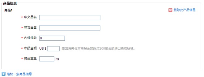 b.如果交易订单包含多个需要申报的品名,请点击“+增加商品描述”填入相应的信息,单个物品有体积限制。