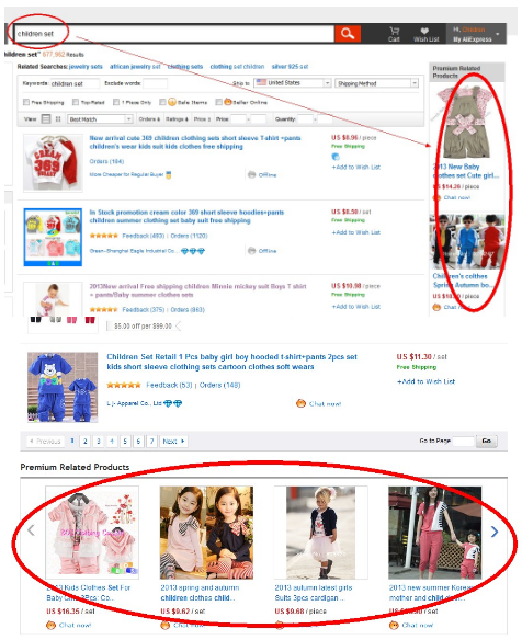 比如说我在搜索栏中输入:children set,在右侧出现5个位置,这就是直通车的显示位置了,还有就是下面的4个位置,所以说一页面直通车的显示位就有9个了,第一页的9个位置,是好多专业车手的必争地了喽