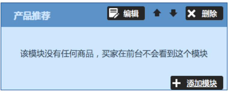 目前能添加三种模块:产品推荐模块(最多添加6个)、系统模块(New Arrivals/Top Selling/Sales Items各1个)以及图片模块(最多添加6个)
