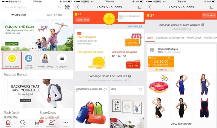 目前有三个面额的AliExpress Coupon供买家兑换,这个Coupon是不分店铺,但仅限App上使用。每天限量发放。