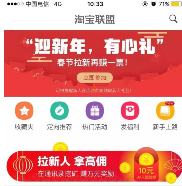 首先打开某宝联盟登陆你的淘客账号,然后再主页面中就可以看到这次推广活动的入口,点击“拉新人,拿高佣”就可以把你的邀请二维码或链接发送给别人。