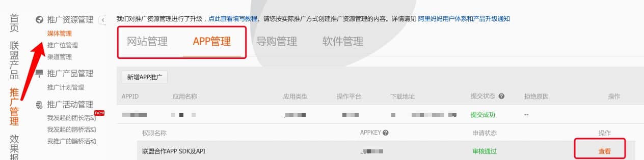 针对媒体管理备案是“网站管理”或“app管理”,可在对应的备案渠道下的appkey点击查看权限