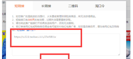 如图,这里显示的有商品的短链接、长链接、二维码、淘口令,这里我们选择的是短链接,这样页面就显示了短链接,点击页面的复制链接。