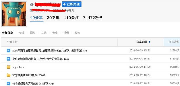 简单的以上面图片中分享的内容举例,ppt的制作模板、ppt小技巧、最近高考季涉及的填报志愿等,这些都是大家在工作和生活中都会需要的,简单说就是大众化的资源,比如最近热映的变形金刚4,你可以找一些电影海报分享出去,或者大家都喜欢的营销课程、seo教程、PS教程等等。