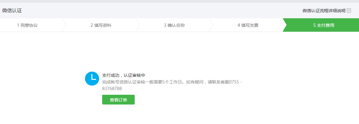 注:我上面认证的时候,也是选择人工验证的,所以等待审核的时间是5个工作日内,所以大家没对公帐号的也别纠结了,直接选择人工验证的方式即可。也就是等待5天内即可完成微信认证,然后就可以使用这个服务号对接我们系统,在你公众号菜单设置你的活动页地址了。