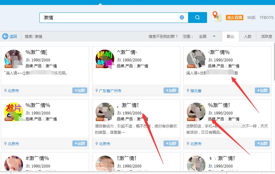 如下图,有些还不如1000人的群在相同设置下的排名,这里面就涉及到一个QQ群排名被屏蔽的问题,那么QQ群被屏蔽的因素有哪些呢?