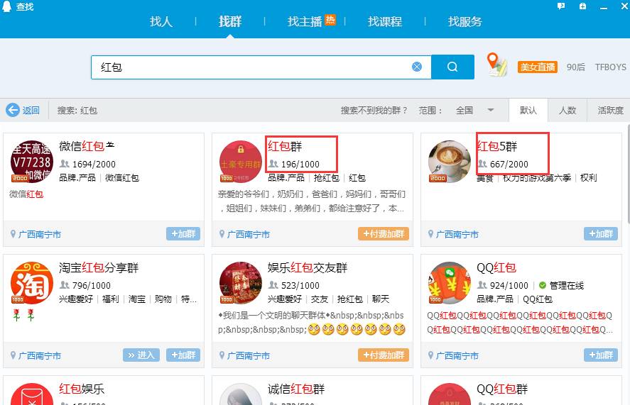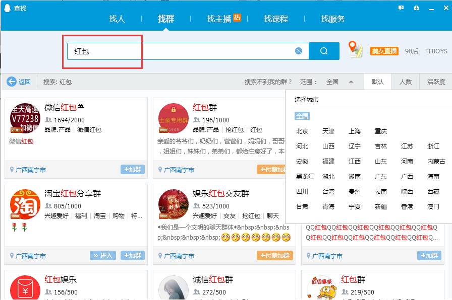 打开QQ的找群界面,输入关键词比如红包,可以看到右边有一些需求规则:范围分为全国和地区,以及还有默认、人数和活跃度。