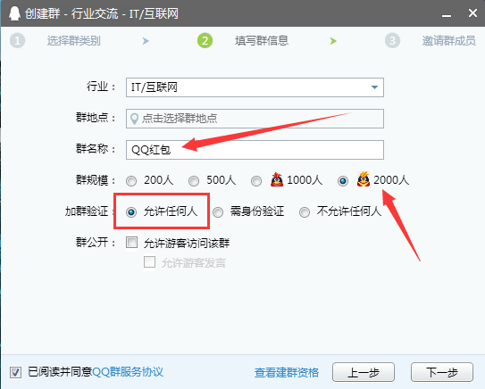 人数:目前QQ群的人数规模有200人、500人、1000人和2000人四种,其中200和500人的都是普通群,而1000人的群需要QQ会员才可以创建,2000人的超级群需要QQ超级会员才可以创建。
