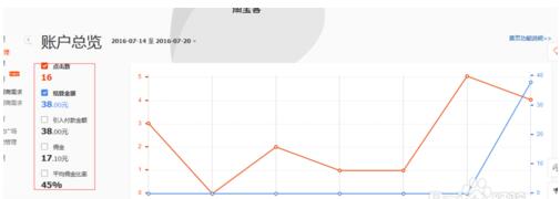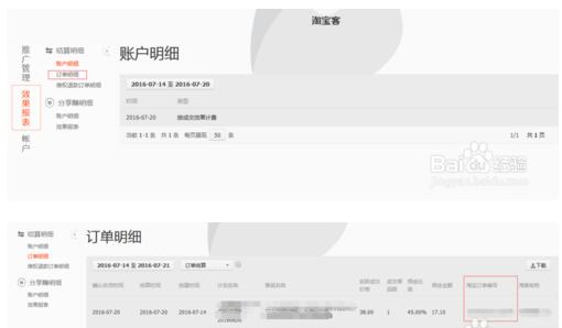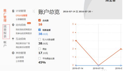 4、我们这里有一笔是淘宝客的,来看看是那个订单产生的,点击左侧的效果报表,进入帐户明细。