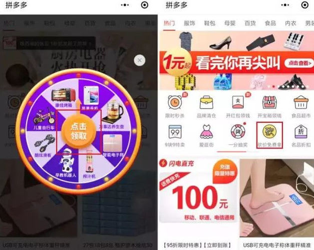打开“拼多多”小程序,就会出现一个摆着8张商品图的转盘。点击“点击领取”的字样,将跳转至“砍价免费拿”。每次打开“拼多多”出现的弹框都不一样,用户也可以从首页点击进入“砍价免费拿”。