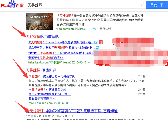 接着,我们在百度搜索一下“天将雄狮”,排在前几名分别是百度贴吧,豆瓣,百度知道。