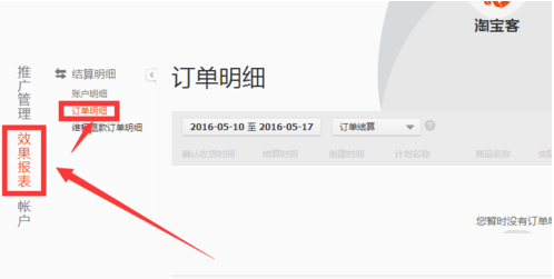 4. 然后点击左侧的效果报表,然后选择订单明细,如图