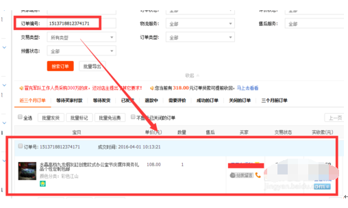 7. 复制这个单里的订单编号到卖家中心,已卖出的宝贝页进行查询,便可知道具体是哪个单了,如图