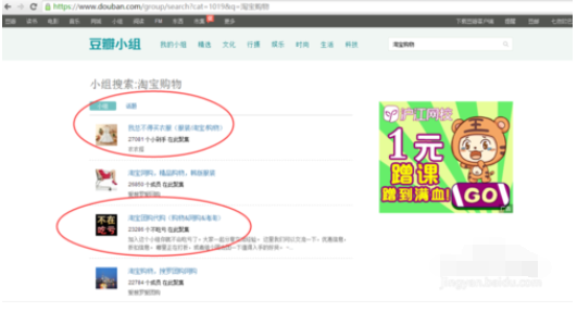 选择豆瓣小组,搜索”淘宝购物“或是”淘宝推广“,加入到相应的小组里面。