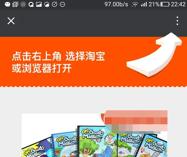 4、根据目前的最新情况来看,淘宝客官方还是做出了相对折衷的应对措施:在客户点击折扣链接之后,会提示客户在微信的右上角用浏览器打开商品页面。