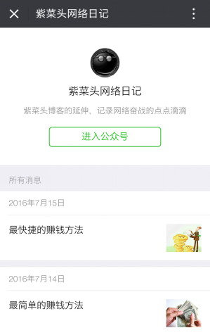 这个页面和我们一般看到的公众号关注页面不一样,包含了logo、介绍,还有历史消息,是一个更加完整的公众号介绍页面,能够大大提高用户的关注率。