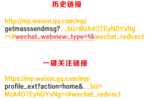 最后,是很关键一步,把历史消息链接稍微改一下,就可以得到一键关注链接了,如下。把历史消息链接中黑色部分【getmasssendmsg?】换成【profile_ext?action=home&】,然后删掉历史消息链接中的红色划线部分【wechat_webview_type=1&】。