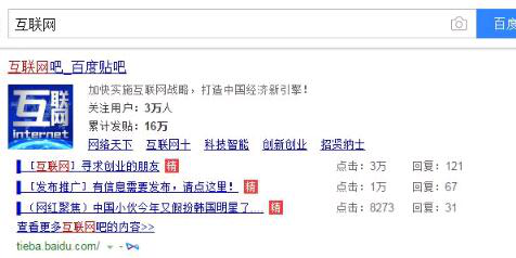 是的,你看到的是一个长尾词贴吧。而我要说的,就是做长尾词贴吧。有经常利用百度搜索资料的朋友就很清楚,大部分百度首页的内容,都能够看到百度贴吧的位置。例如输入关键词“互联网”,就能看到关于“互联网”的贴吧。