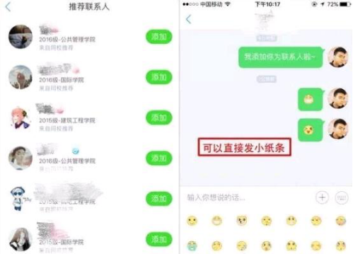 小纸条界面有推荐人的功能,可以直接无限添加。小编亲测一个号可以直接添加50+人/日/次,意味着你可以把编辑好的信息直接发送给他。当然我们不能直接暴力发广告,可以先熟络熟络感情。以学长学姐的名义,更加容易获取信任。