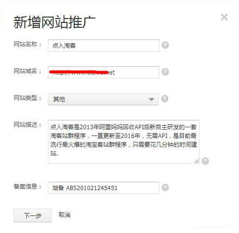4、填写网站信息,建议使用备案域名,因为阿里是人工审核;不备案的有时也可以通过,看运气淘点金怎么申请?淘点金申请教程.jpg