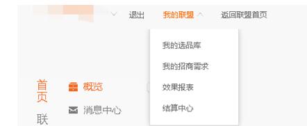 2、进入淘宝联盟后,在左上角找到我的联盟标签,打开下拉菜单。如图所示: