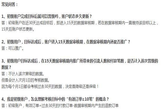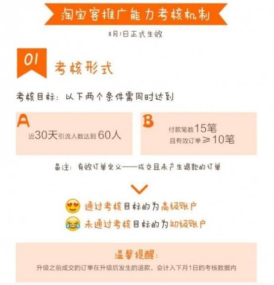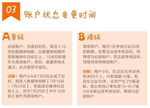 此次账户状态第一次正式变更时间为8月1日,即8月1日考核淘客在7月2日-7月31日的推广成果,如果该账户未达到考核目标,就会变成初级账户。