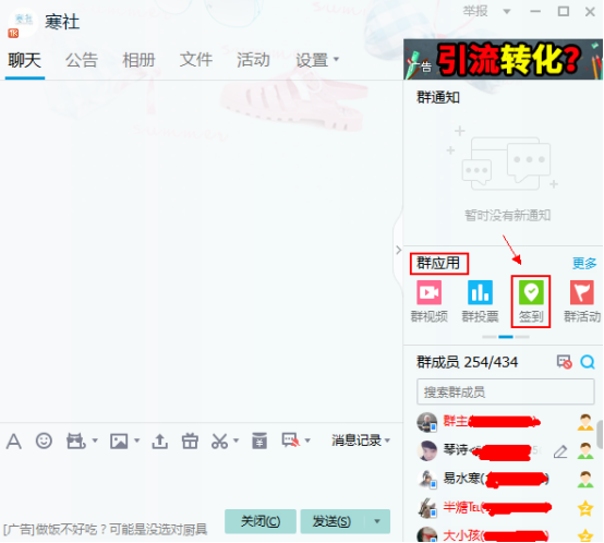 群的维护,有几点要注意,在你的亲友群,找单多互动,没事发点小红包,然后告诉她们在什么时间有免单活动,固定一个时间,在群里举行一个活动。最好是限制一下,免单的资格。比如在群里签到满几天才能参与。QQ群的签到在群里就有。