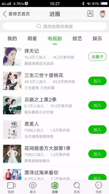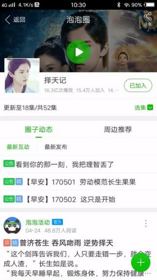 由上可知,在下方可以看到多个按钮选项,点击“进圈”会发现很多圈子,圈子根据人物或视频名称分类,如热门视频《择天记》,可点击进入。