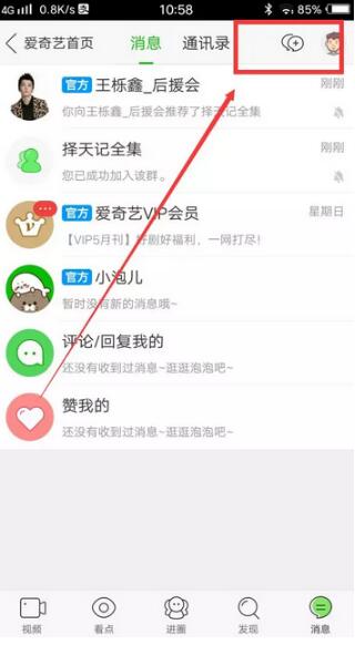 提到群聊大家应想到Q群、微信群,其实爱奇艺也有群。而且爱奇艺的群粉丝是更为精准,大多主题明确粉丝粘度高。而且可以自己建群,同样进入“泡泡”点击右下角“消息”即可进入该页面,右上角的加号图标,如下图。