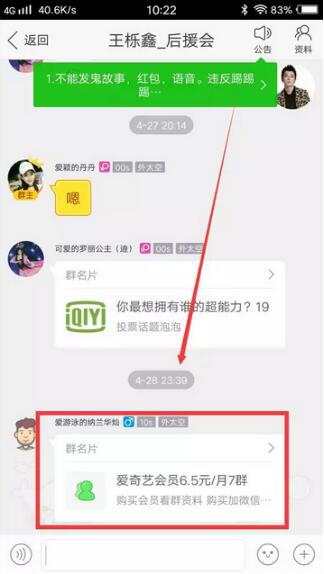 建群后,可以邀请好友进入,也可以将自己群名片发到其他群,如下图。
