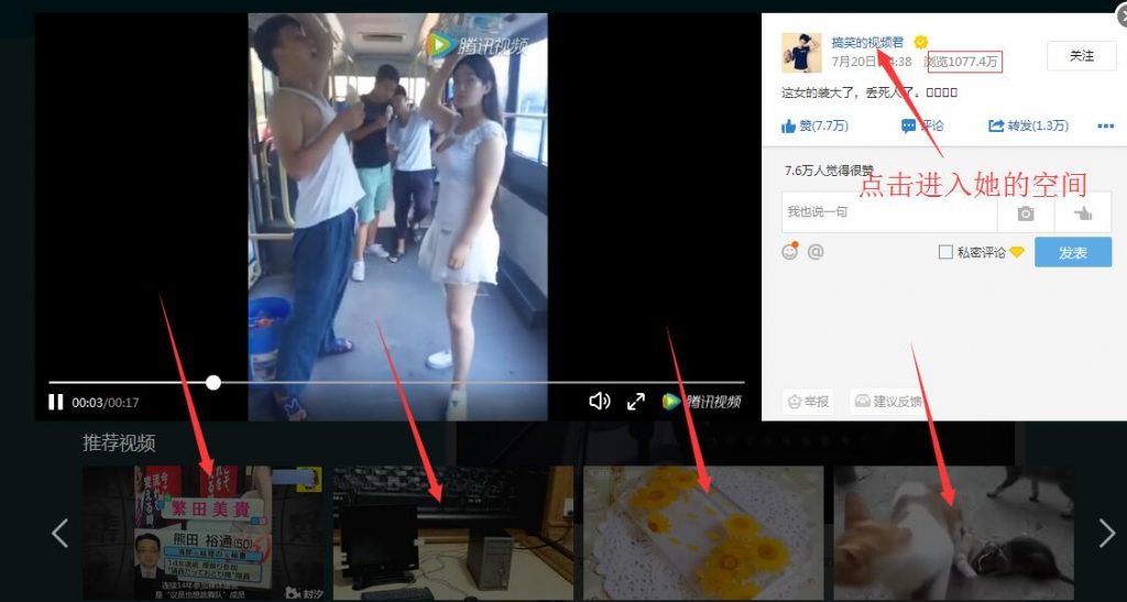 那么,如何大量找到这样的空间呢?这时我们可以随便点击一个视频,进入播放页面,下方就看到很多推荐视频,一个一个的进入她的空间去点赞。